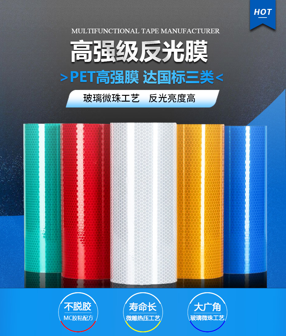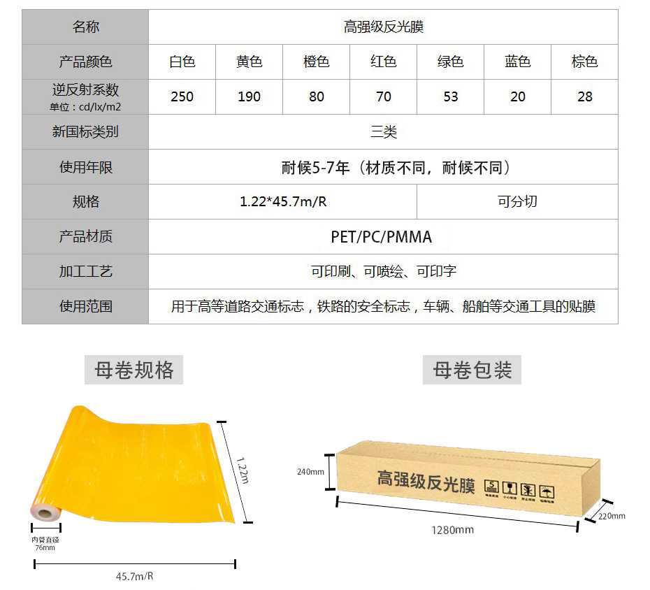 【產(chǎn)品材質(zhì)】PET/PC/PMMA,反光性能優(yōu)異,可用于各種公路,鐵路,航道和城市主干道的交通標(biāo)志導(dǎo)向牌,指示牌,礦山機(jī)場(chǎng)安全牌,以及車輛,船舶的車身反光貼膜